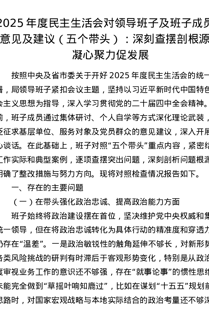 2025年度五个带头xxxxx对领导班子及班子成员的意见及建议(五个带头):深刻查摆剖根源,凝心聚力促发展