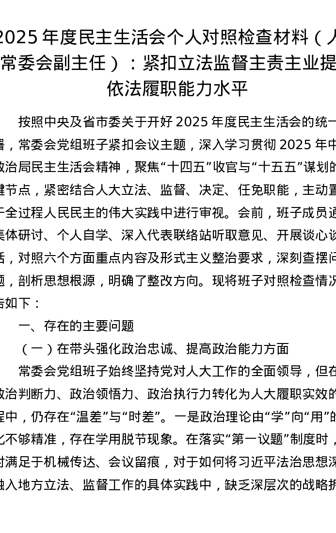 2025年度五个带头xxxxx个人对照检查材料(人大常委会副主任):紧扣立法监督主责主业 提升依法履职能力水平