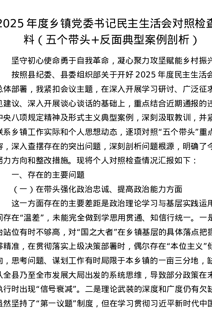 2025年度乡镇党委书记xxxxx对照检查材料(五个带头+反面典型案例剖析)