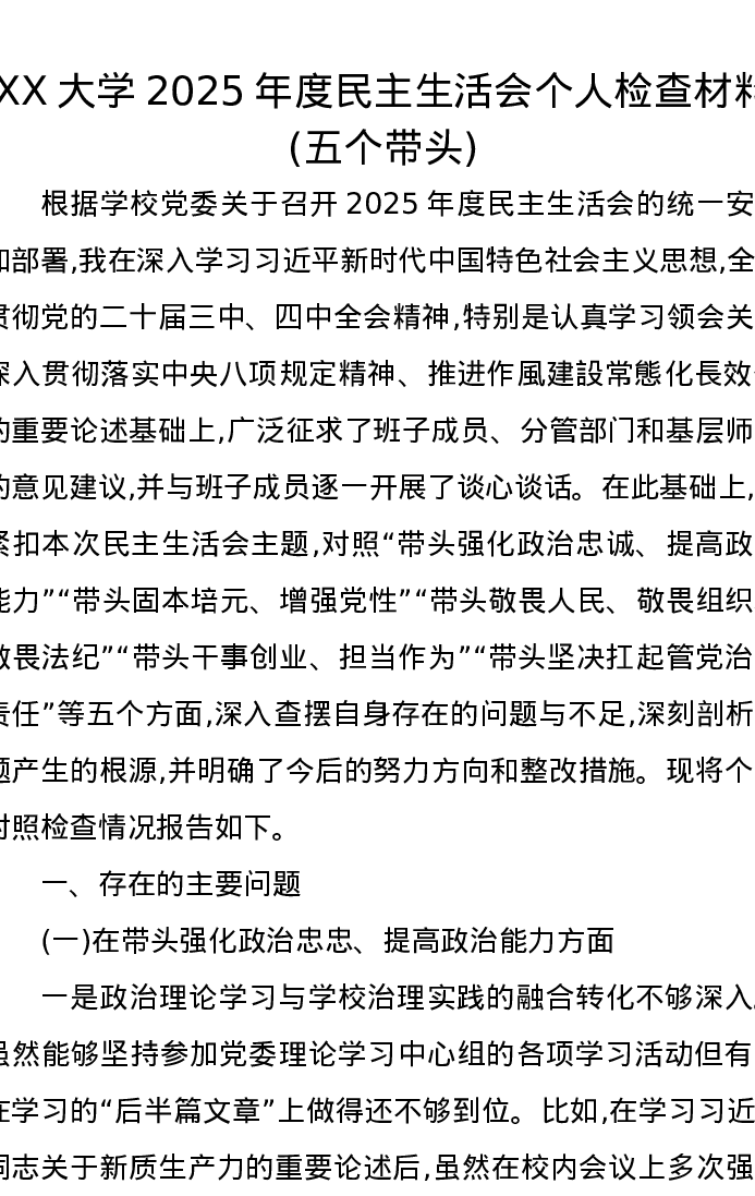 XX大学2025年度xxxxx个人检查材料(五个带头)
