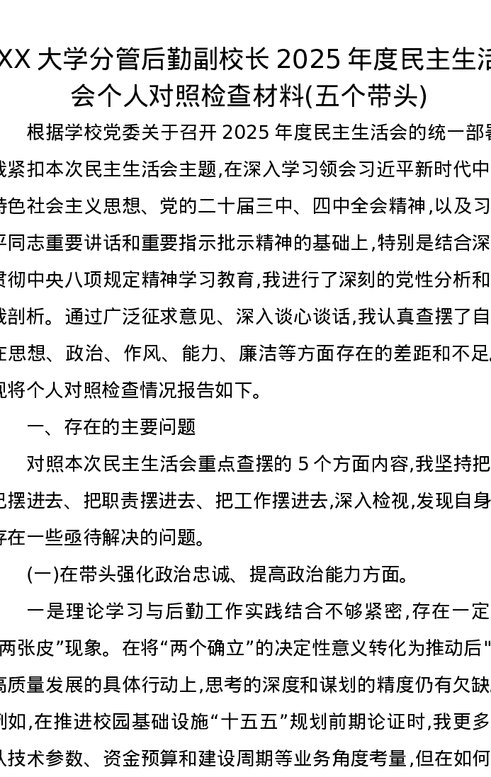 XX大学分管后勤副校长2025年度xxxxx个人对照检查材料(五个带头)