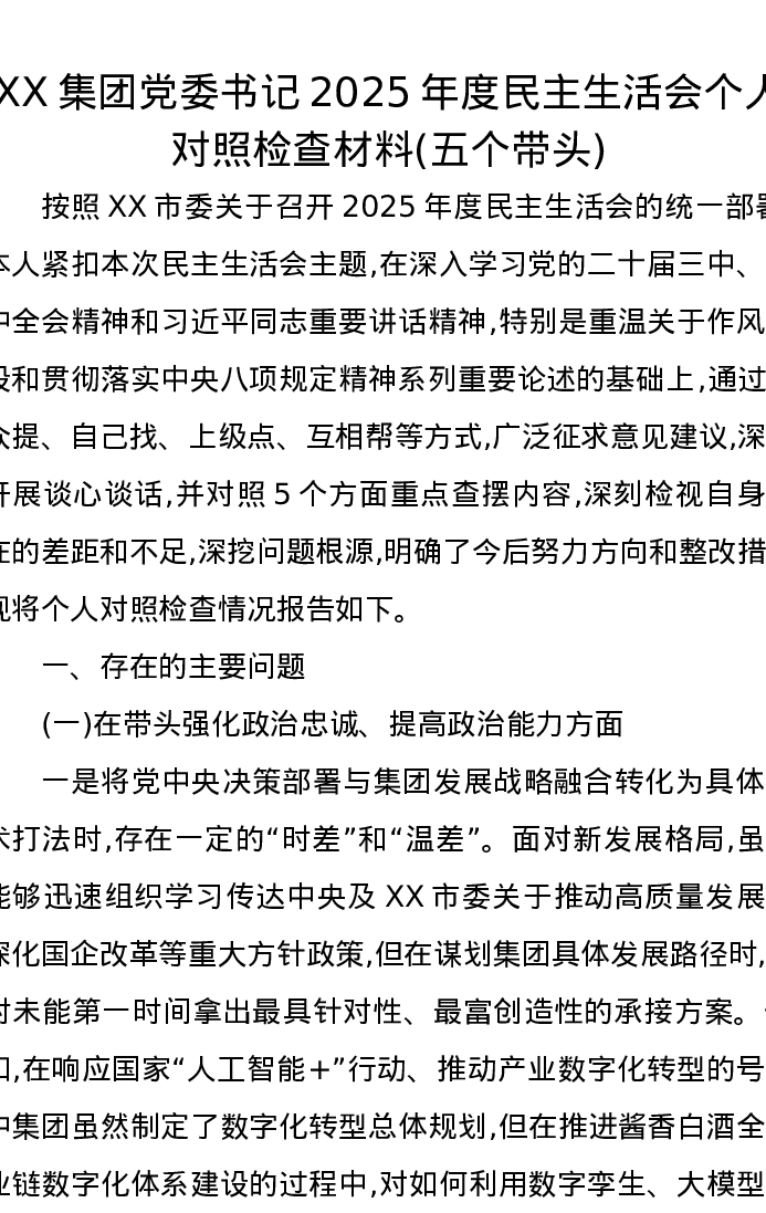 XX集团党委书记2025年度xxxxx个人对照检查材料(五个带头)1