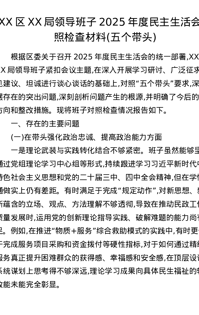 XX区XX局领导班子2025年度xxxxx对照检查材料(五个带头)