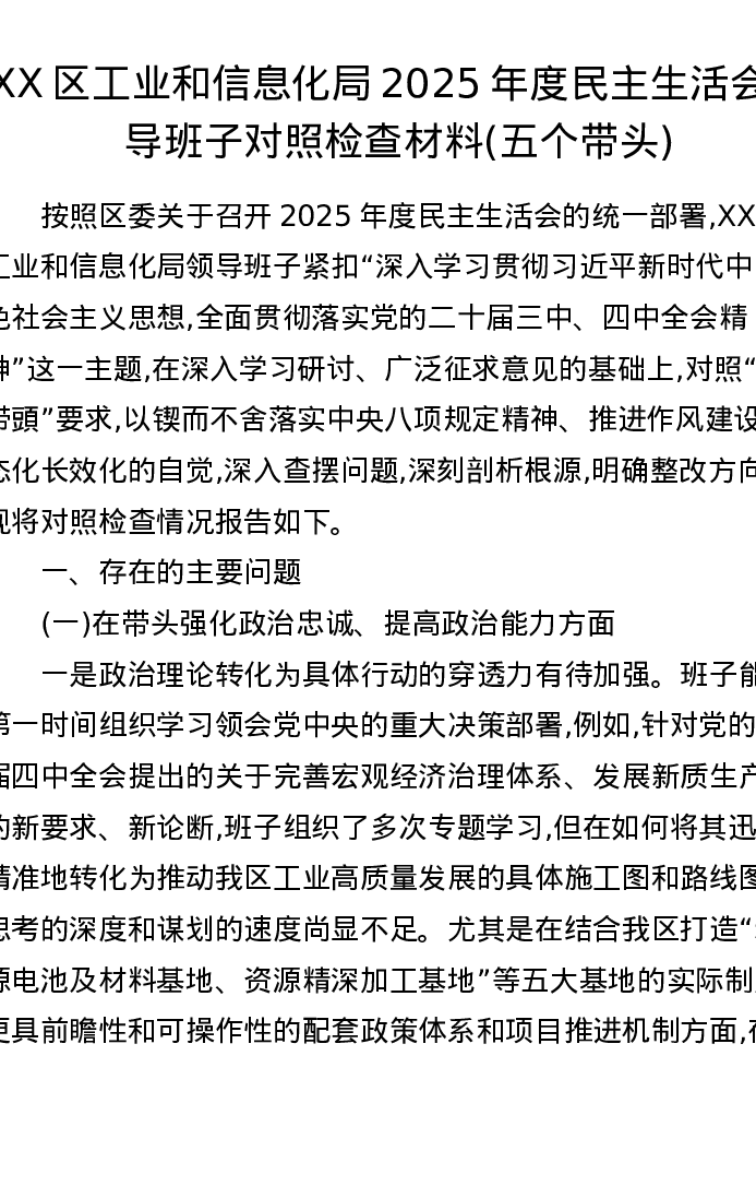 XX区工业和信息化局2025年度xxxxx领导班子对照检查材料(五个带头)