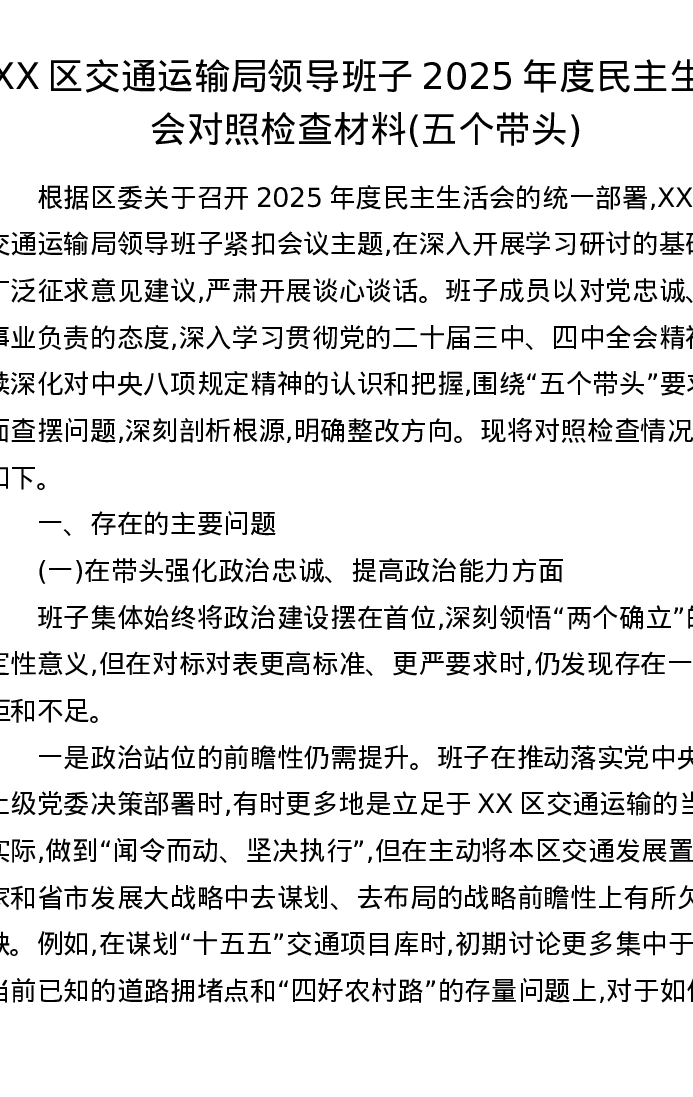 XX区交通运输局领导班子2025年度xxxxx对照检查材料(五个带头)
