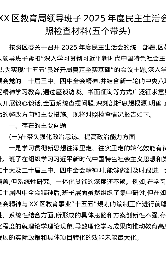 XX区教育局领导班子2025年度xxxxx对照检查材料(五个带头)