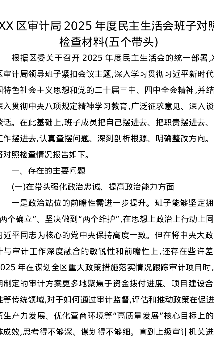 XX区审计局2025年度xxxxx班子对照检查材料(五个带头)
