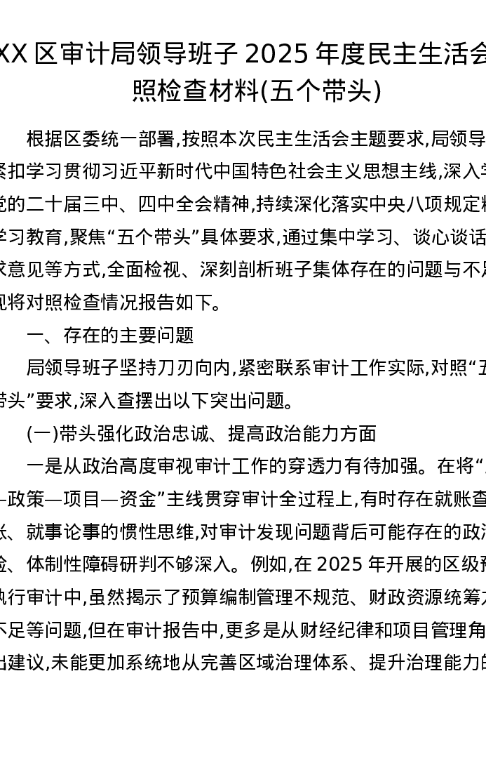 XX区审计局领导班子2025年度xxxxx对照检查材料(五个带头)
