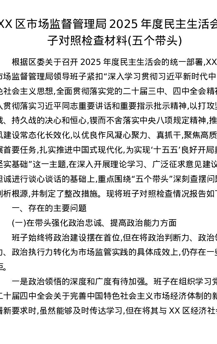 XX区市场监督管理局2025年度xxxxx班子对照检查材料(五个带头)