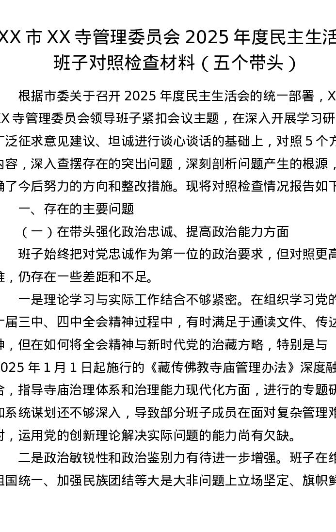 XX市XX寺管理委员会2025年度xxxxx班子对照检查材料(五个带头)