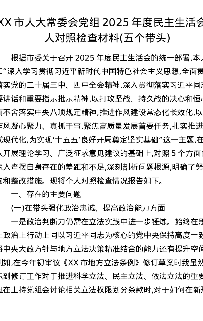 XX市人大常委会党组2025年度xxxxx个人对照检查材料(五个带头)