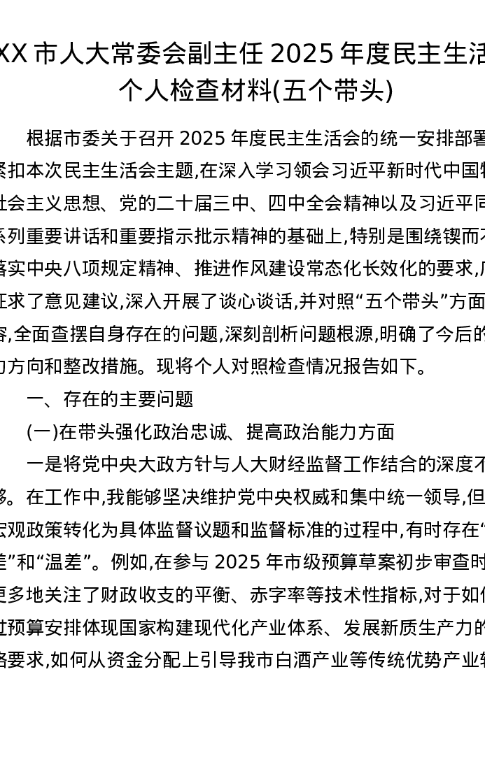XX市人大常委会副主任2025年度xxxxx个人检查材料(五个带头)
