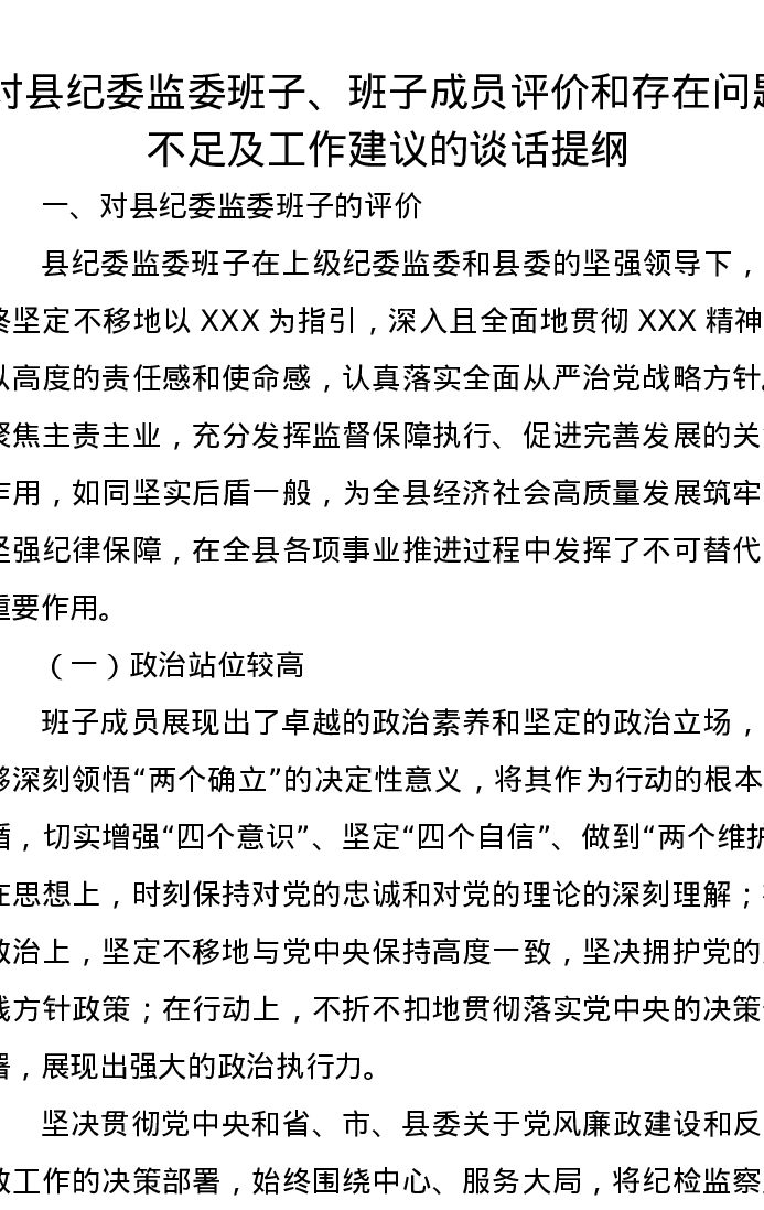 对县纪委监委班子、班子成员评价和存在问题不足及工作建议的谈话提纲