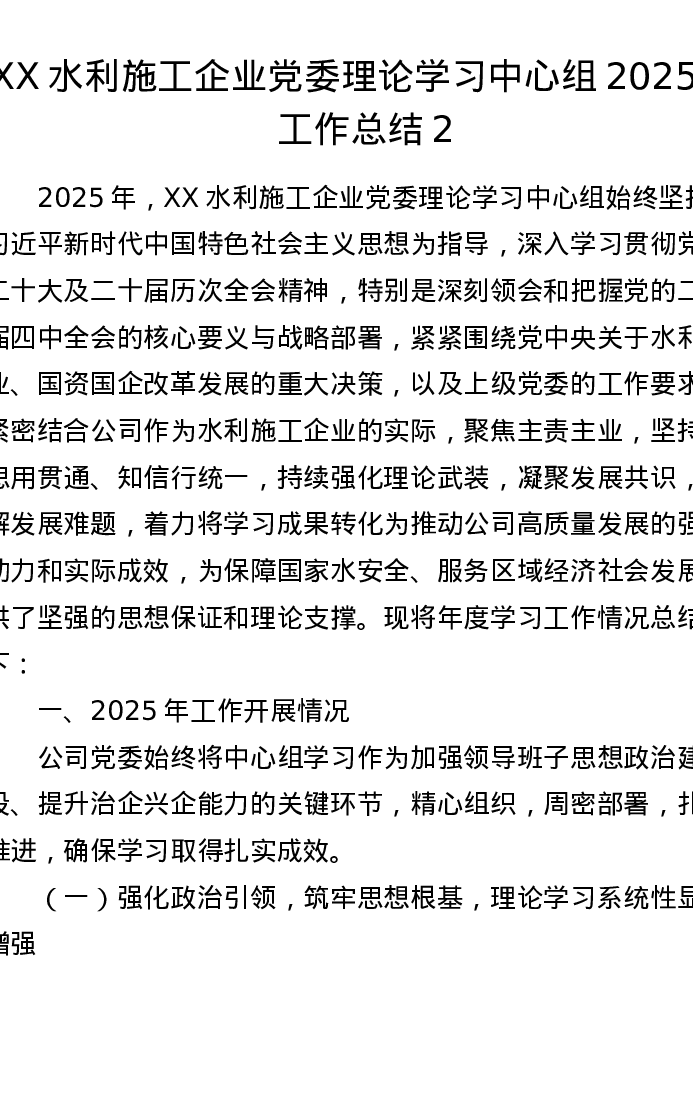 XX水利施工企业党委理论学习中心组2025年工作总结2