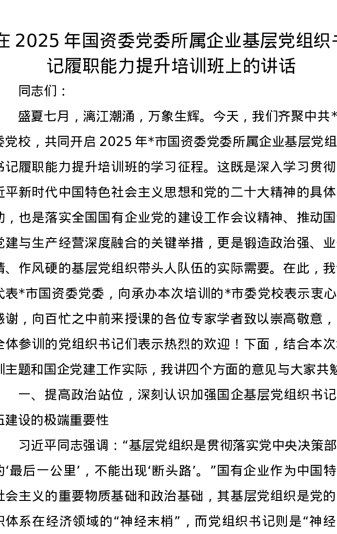 在2025年国资委党委所属企业基层党组织书记履职能力提升培训班上的讲话