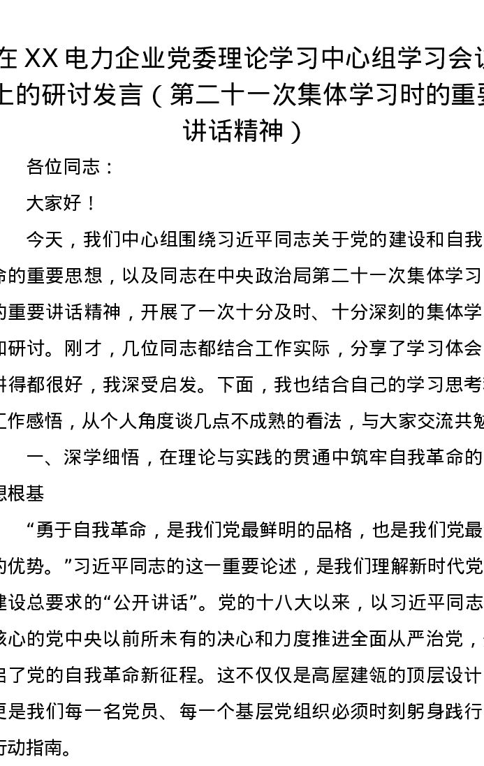 在XX电力企业党委理论学习中心组学习会议上的研讨发言(第二十一次集体学习时的重要讲话精神)