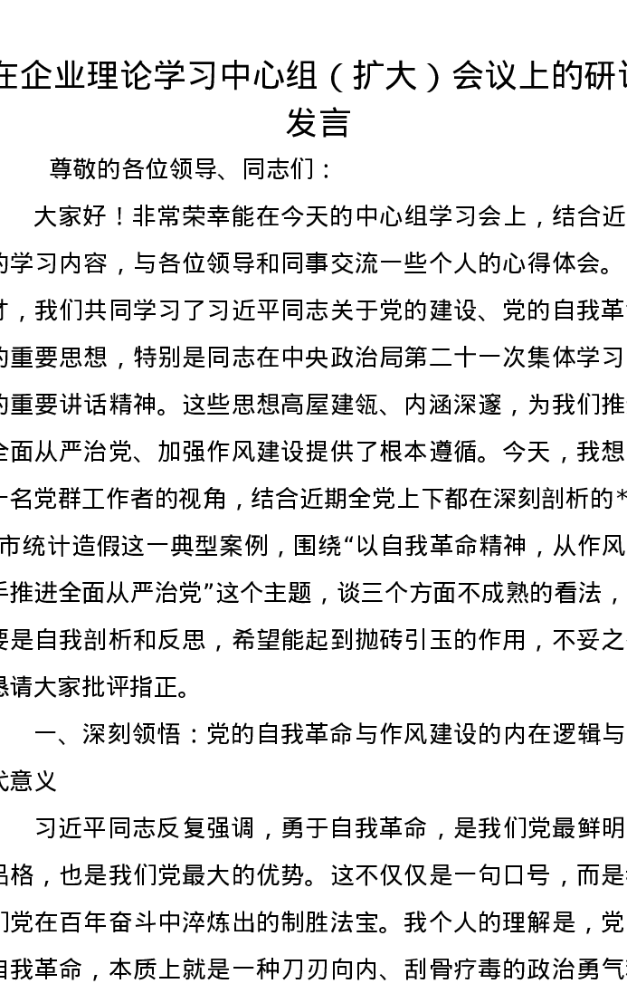 在企业理论学习中心组(扩大)会议上的研讨发言