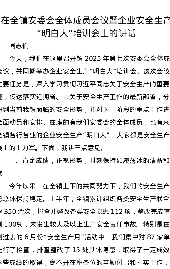在全镇安委会全体成员会议暨企业安全生产明白人培训会上的讲话