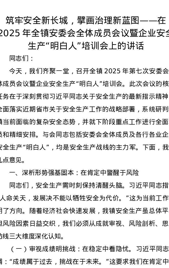 筑牢安全新长城,擘画治理新蓝图——在2025年全镇安委会全体成员会议暨企业安全生产明白人培训会上的讲话