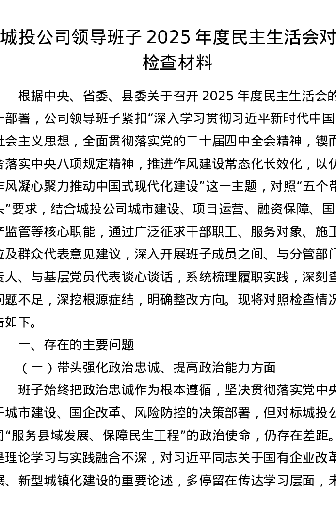 【原创】城投公司领导班子2025年度xxxxx对照检查材料(五个带头)
