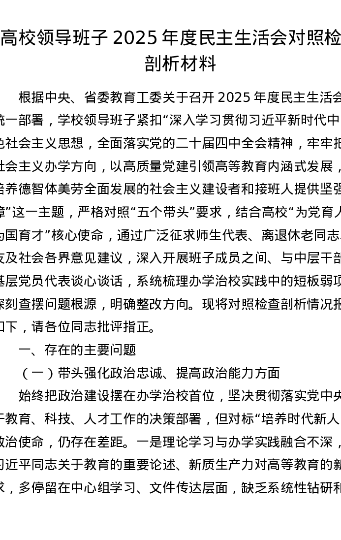 【原创】高校领导班子2025年度xxxxx对照检查剖析材料(五个带头)