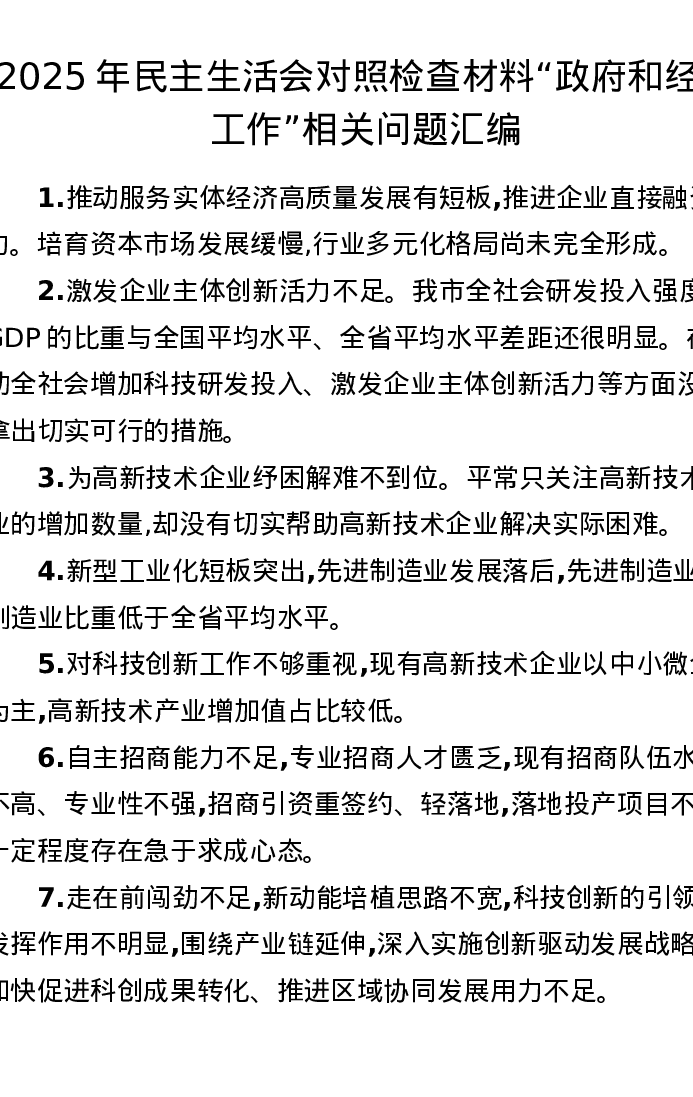 2025年xxxxx对照检查材料政府和经济工作相关问题汇编