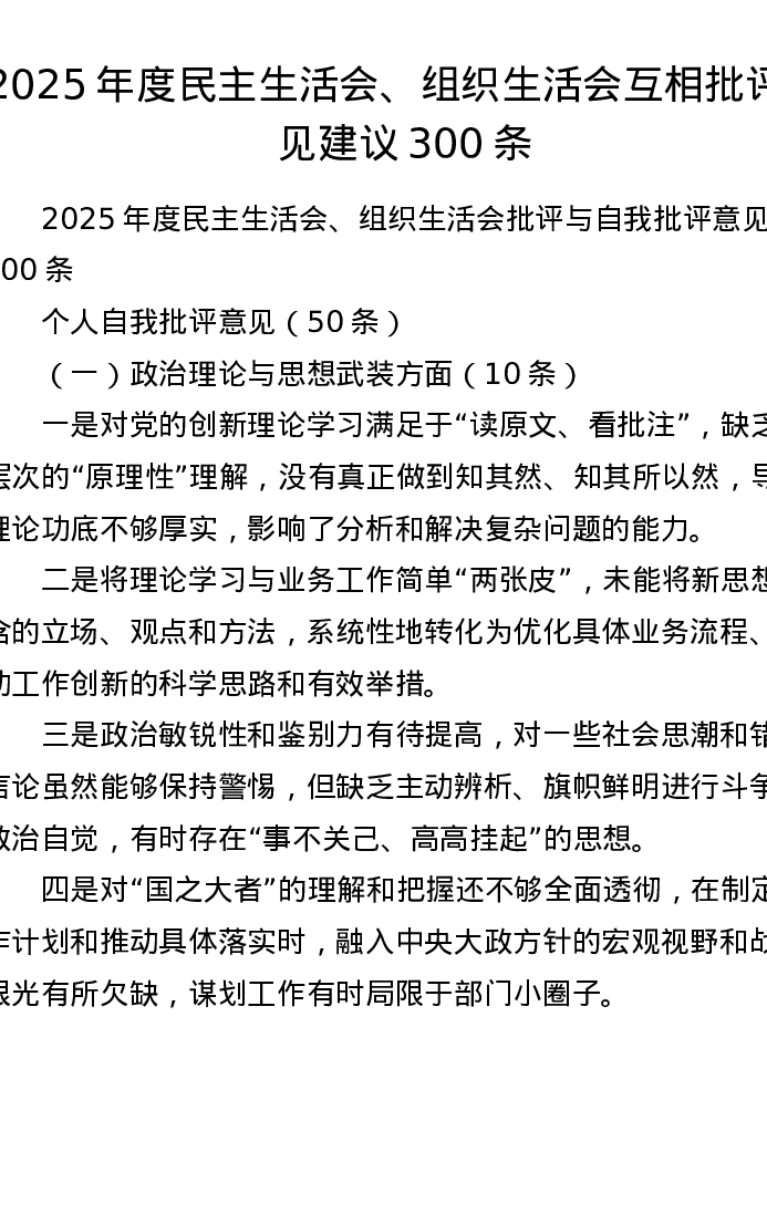 2025年度xxxxx、组织xxx互相批评意见建议300条