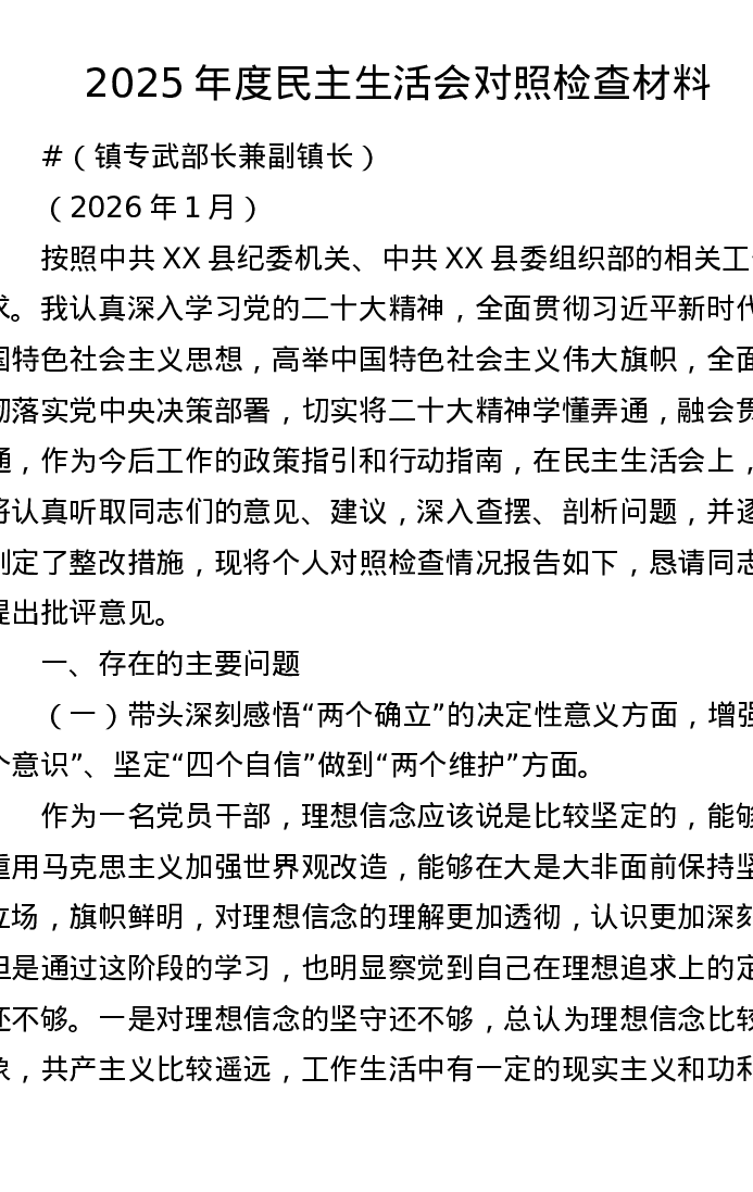 2025年度xxxxx对照检查材料(镇专武部长兼副镇长)