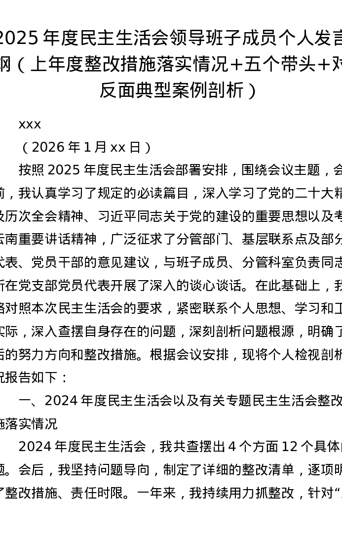 2025年度xxxxx领导班子成员个人发言提纲(上年度整改措施落实情况+五个带头+对照反面典型案例剖析)