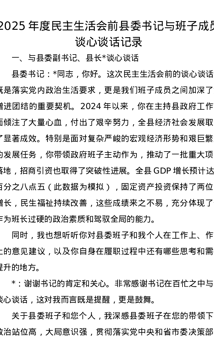 2025年度xxxxx前县委书记与班子成员谈心谈话记录