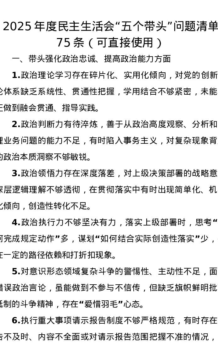 2025年度xxxxx五个带头问题清单75条(可直接使用)