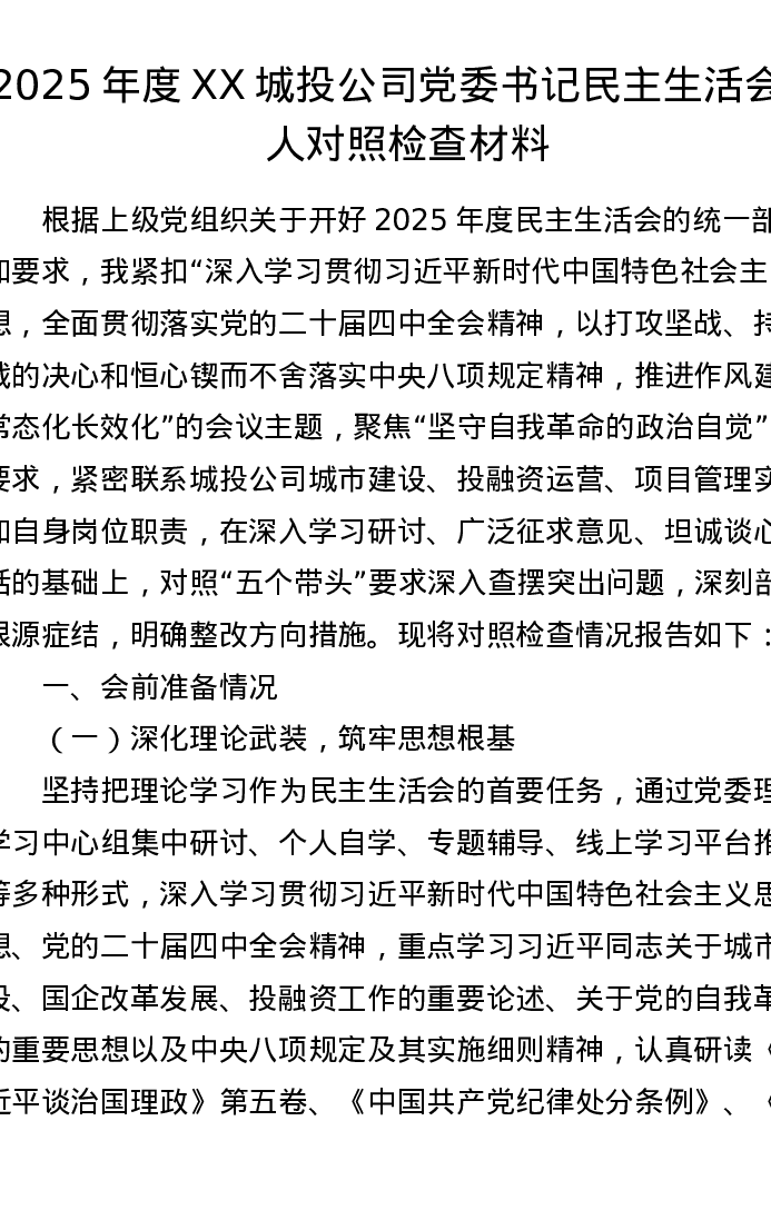 2025年度XX城投公司党委书记xxxxx个人对照检查材料(五个带头)