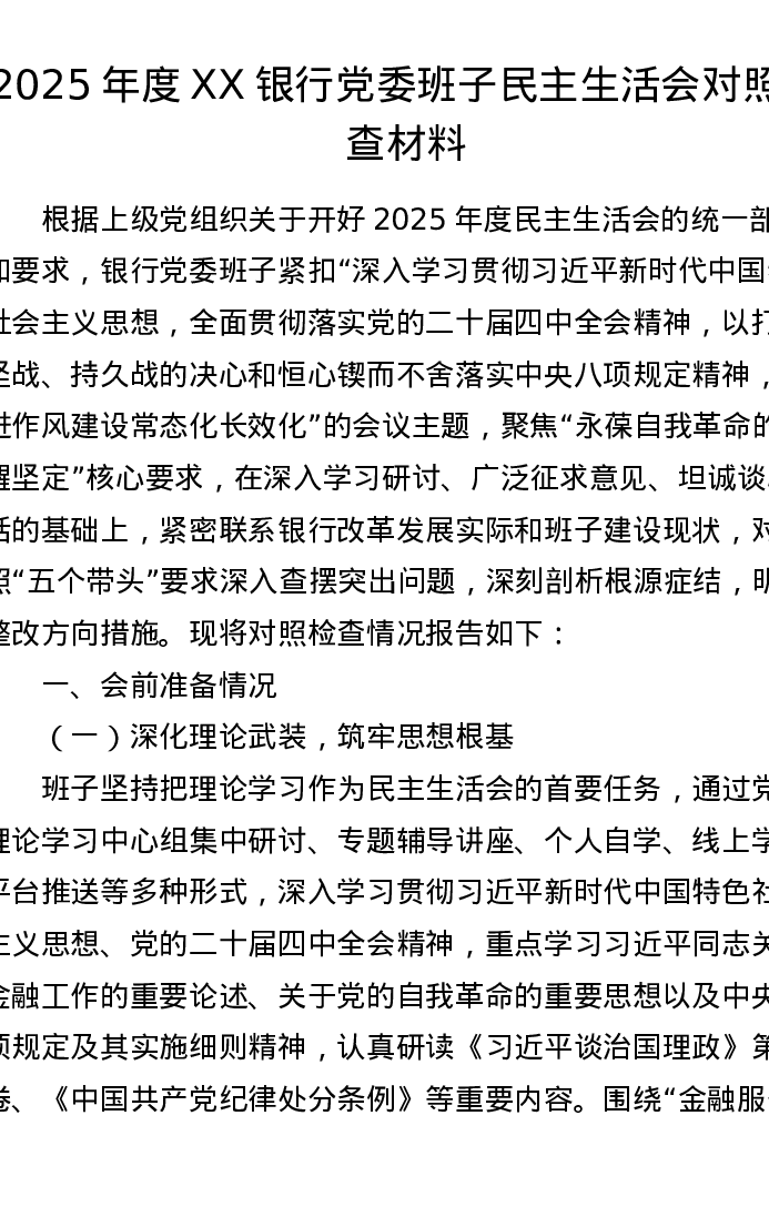 2025年度XX银行党委班子xxxxx对照检查材料(6168字)(五个带头)