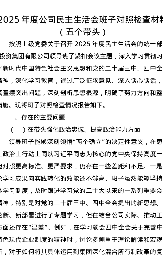 2025年度公司xxxxx班子对照检查材料(五个带头)