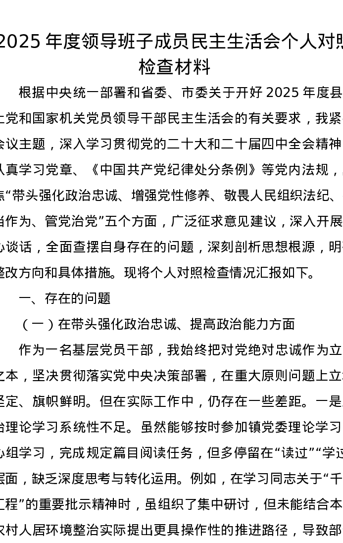 2025年度领导班子成员xxxxx个人对照检查材料(五个带头)