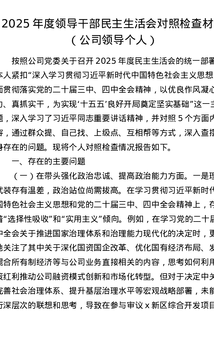 2025年度领导干部xxxxx对照检查材料(公司领导个人)(五个带头)