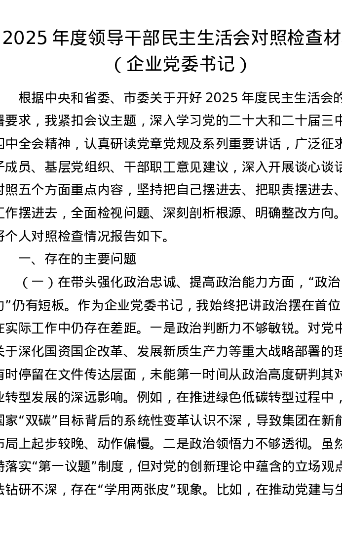 2025年度领导干部xxxxx对照检查材料(企业党委书记)(五个带头)
