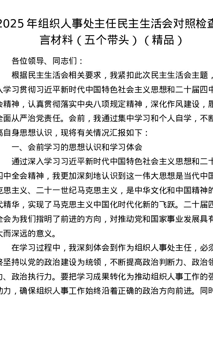 2025年组织人事处主任xxxxx对照检查发言材料(五个带头)