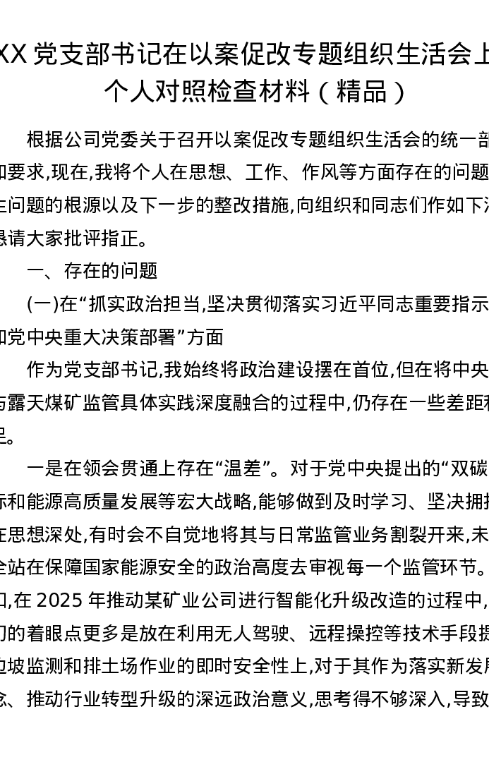 XX党支部书记在以案促改专题组织xxx上的个人对照检查材料