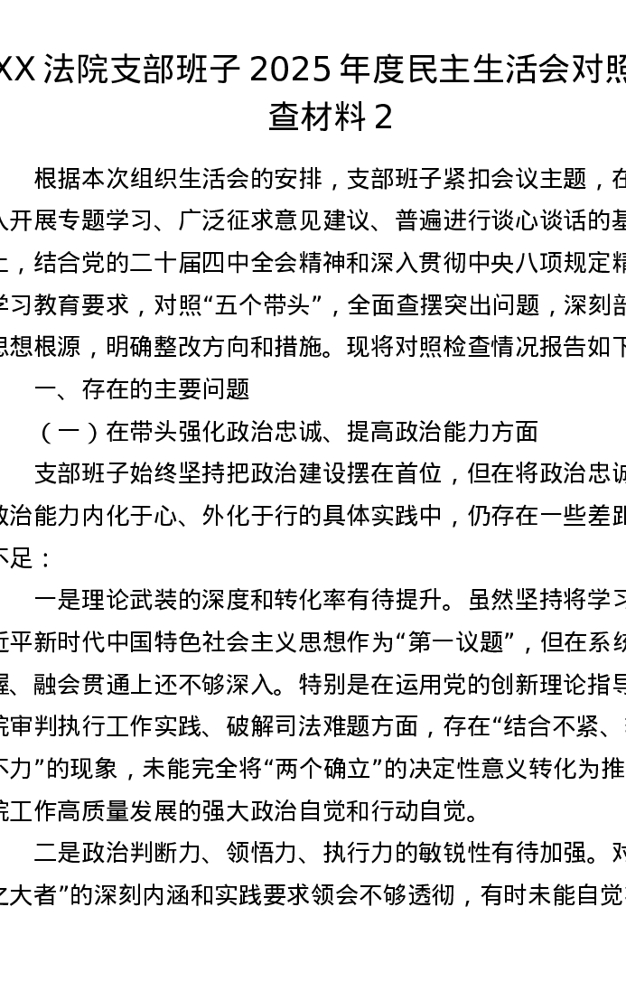 XX法院支部班子2025年度xxxxx对照检查材料2(五个带头)