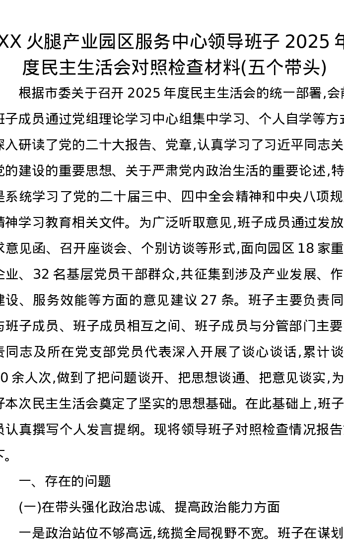 XX火腿产业园区服务中心领导班子2025年度xxxxx对照检查材料(五个带头)