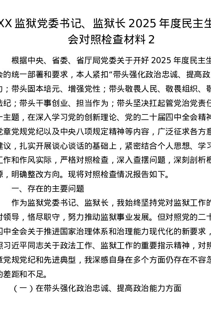 XX监狱党委书记、监狱长2025年度xxxxx对照检查材料2(五个带头)