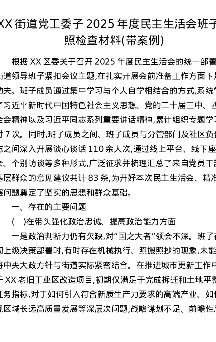 XX街道党工委子2025年度xxxxx班子对照检查材料(带案例)(五个带头)