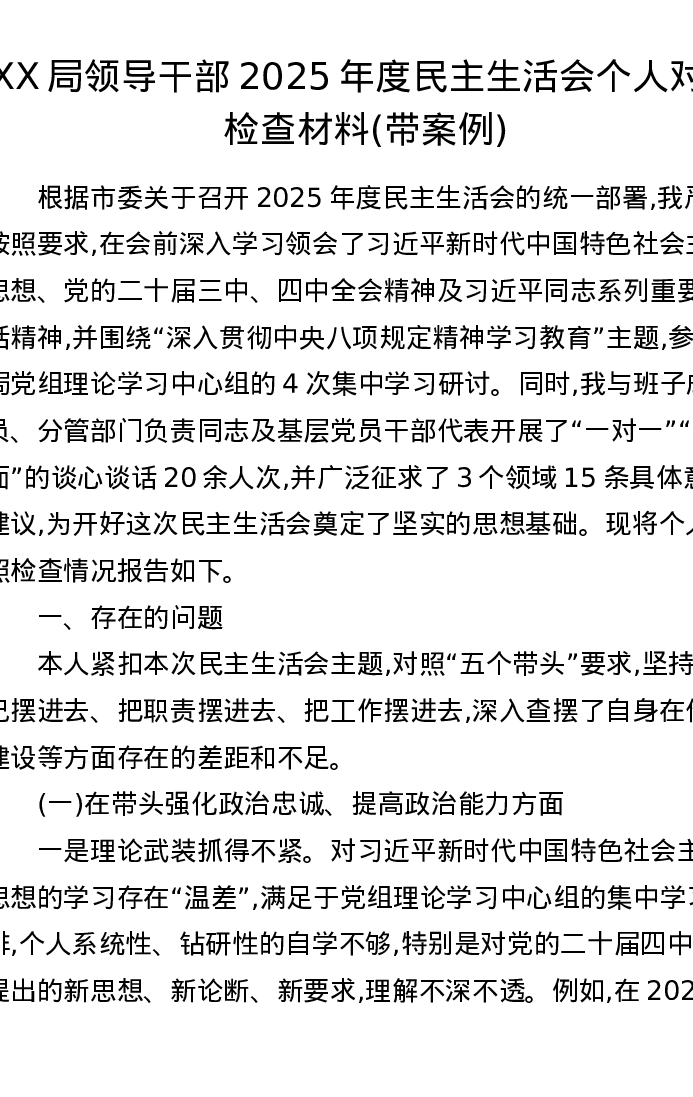 XX局领导干部2025年度xxxxx个人对照检查材料(带案例(五个带头))