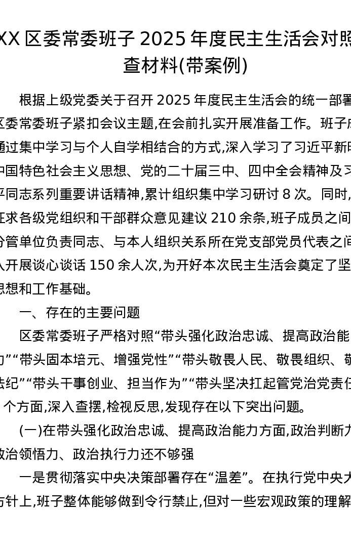 XX区委常委班子2025年度xxxxx对照检查材料(带案例)(五个带头)