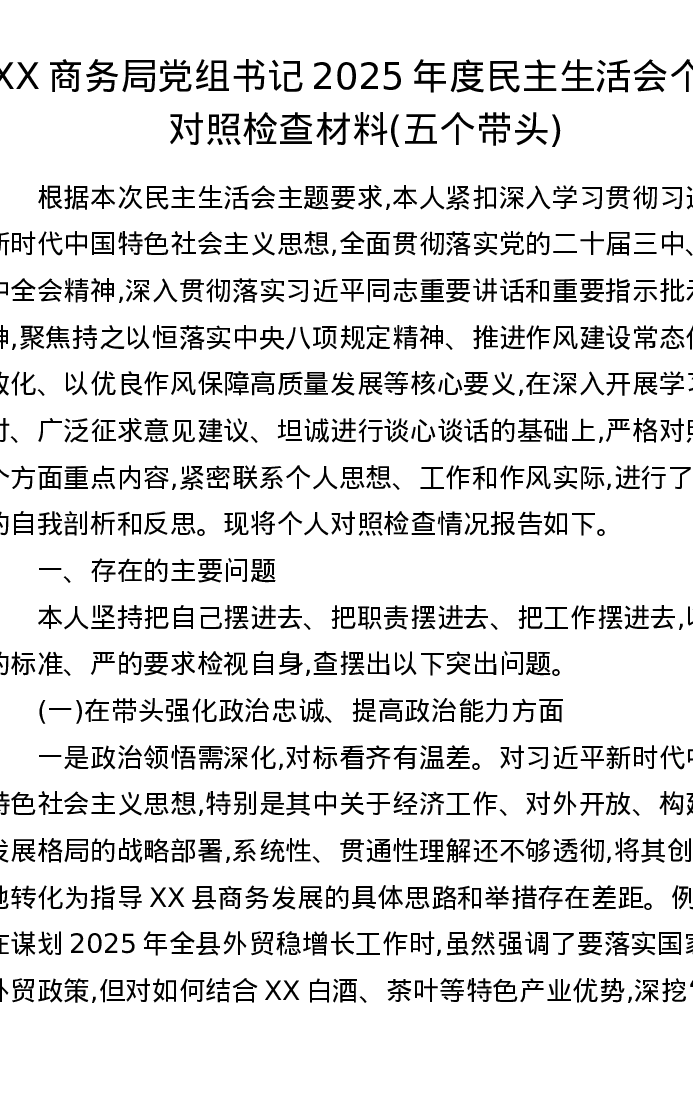 XX商务局党组书记2025年度xxxxx个人对照检查材料(五个带头)