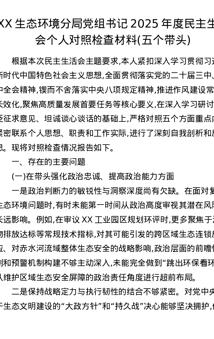 XX生态环境分局党组书记2025年度xxxxx个人对照检查材料(五个带头)