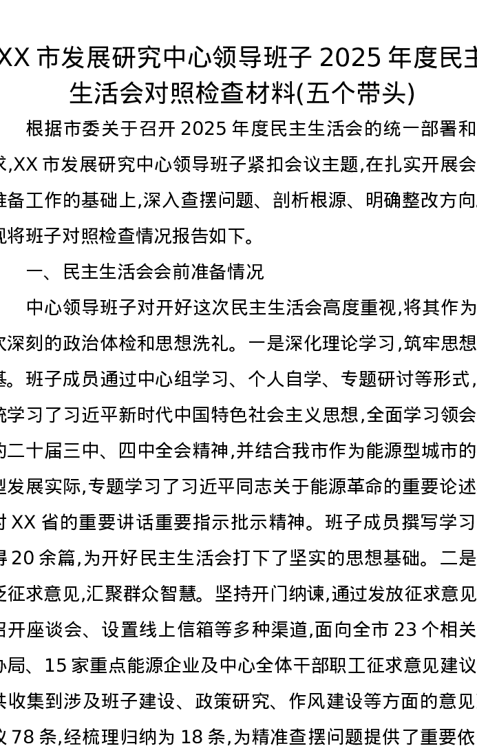 XX市发展研究中心领导班子2025年度xxxxx对照检查材料(五个带头)