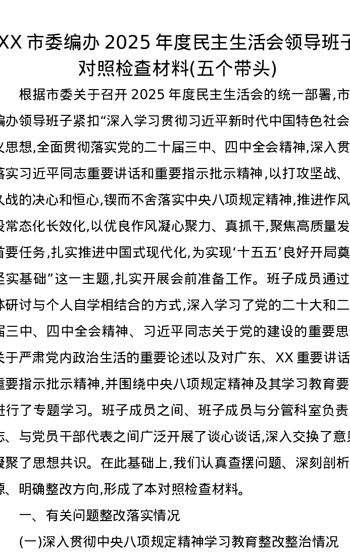XX市委编办2025年度xxxxx领导班子对照检查材料(五个带头)