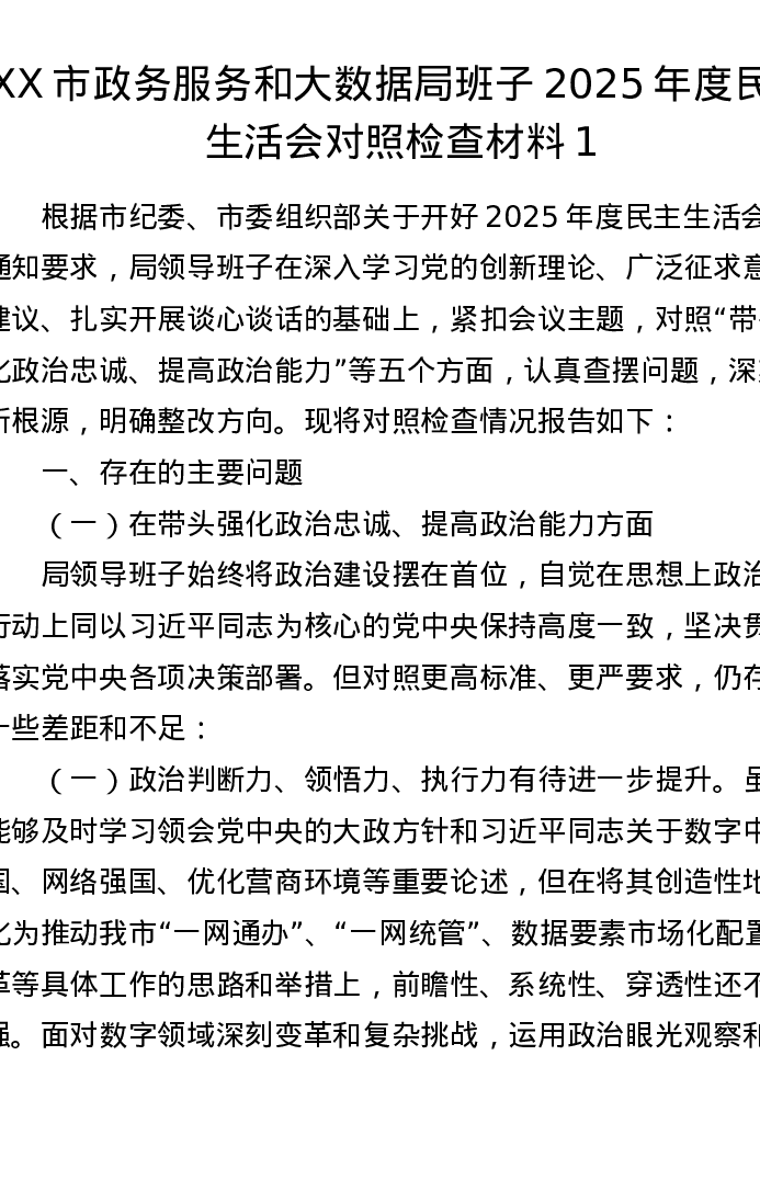 XX市政务服务和大数据局班子2025年度xxxxx对照检查材料1(五个带头)